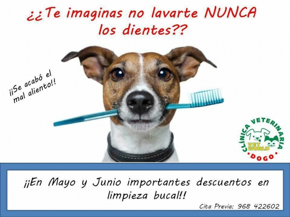 ¿Tu mascota tiene la boca sucia, mal aliento? Una limpieza bucal a tiempo te ahorrará disgustos y enfermedades graves(pérdida de piezas dentarias precozmente, gingivitis, endocarditis, etc) y dinero. Ahora con importantes descuentos durante mayo y junio. Consúltanos.